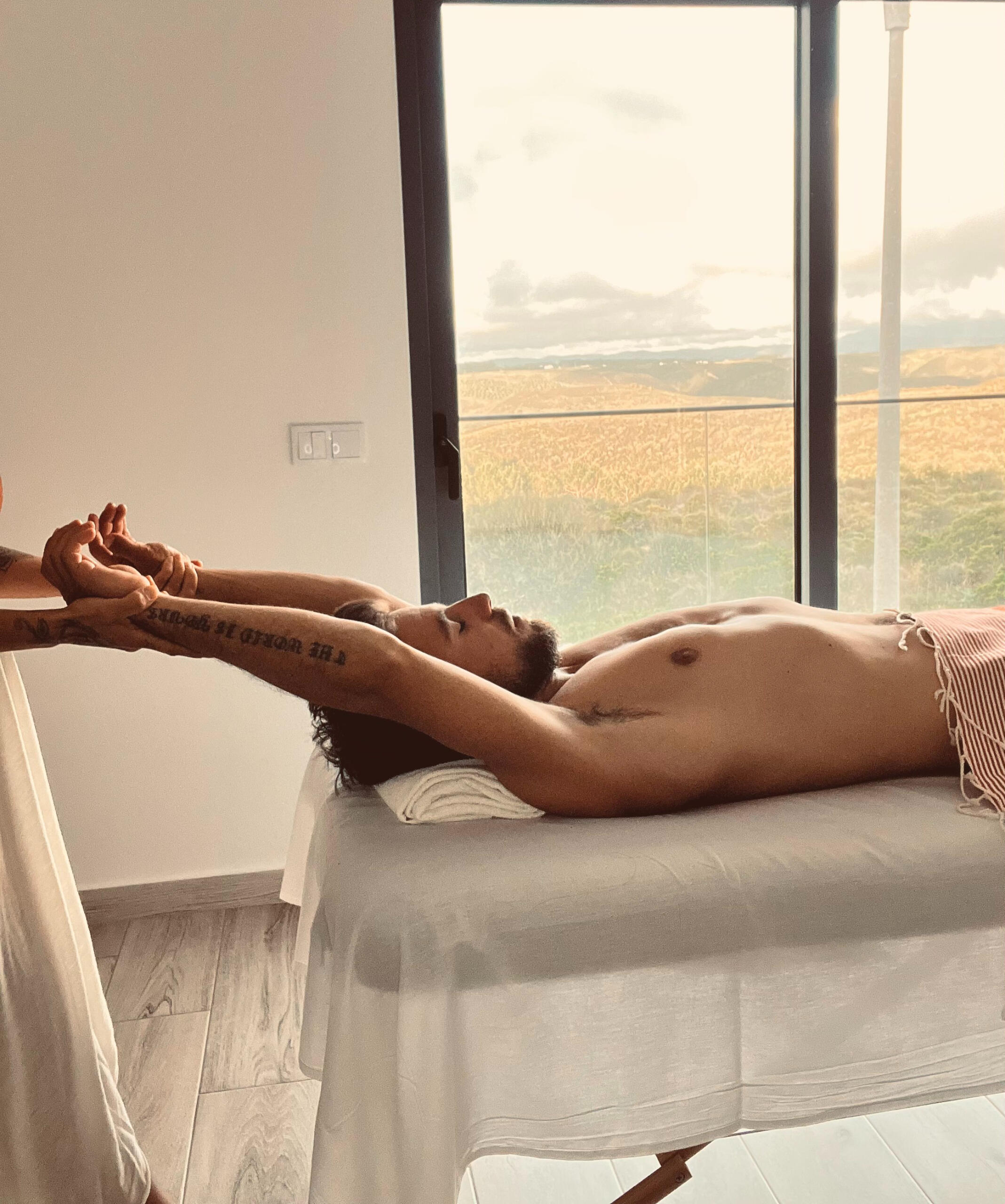 Massage sessions take place in a peaceful setting in Aljezur, Portugal, at the Down Collective Shala near Arifana Beach, in the heart of the Costa Vicentina Natural Park.